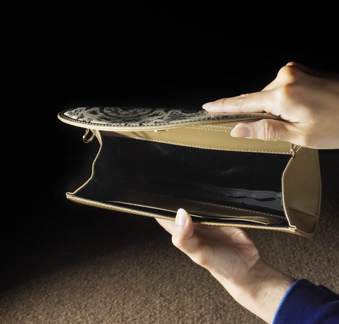 This handcrafted brocade clutch features an auspicious “Crane and Deer in Spring” pattern — a traditional Chinese motif symbolizing longevity, harmony, and prosperity. The intricate gold jacquard weave is paired with sleek faux leather for a blend of cultural richness and modern elegance.